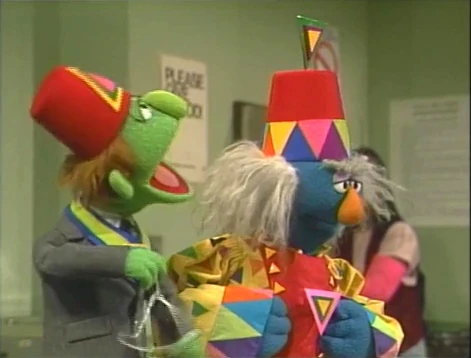 Dr. Sing says goodbye to Telly as he leaves when all of a sudden, they hear the fanfare music of none other than the Grand High Triangle Lover! They look outside in awe, and witness as His Triangleness enters with Norman loudly dinging away. |