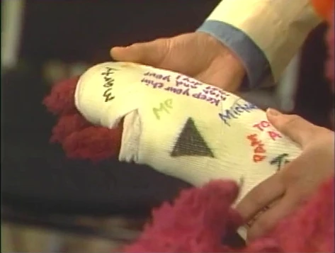 When Telly sees Dr. Sing, he hopes the appointment will be done soon because he doesn't want to miss seeing the GHTL. Dr. Sing understands - as it turns out, he was a Triangle Lover himself when he was a kid! He points to his membership certificate on the wall, and promises to finish with Telly as soon as possible. He makes sure that the cast fits properly, and that Telly can wiggle his fingers. The visit is almost done when Telly describes that he has difficulty sleeping with the cast; Dr. Sing suggests putting a pillow under it. |