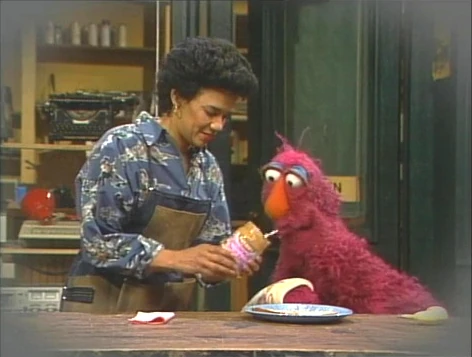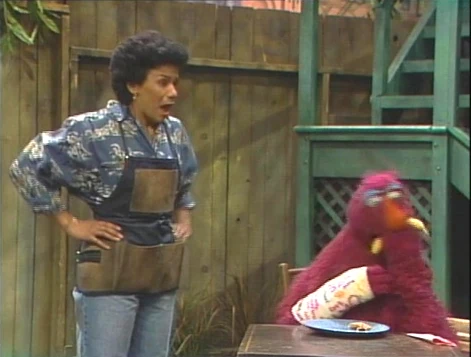 Back in the present, Telly has finished his sandwich and is ready to eat his banana for dessert. Maria doubts that he can eat it with a broken arm, but he says he can manage. To Maria's amazement, Telly devours the entire banana, peel and all! "Cookie Monster taught me how to do that," he says, daintily dabbing his mouth with a napkin. "After all - I am a monster!" |
