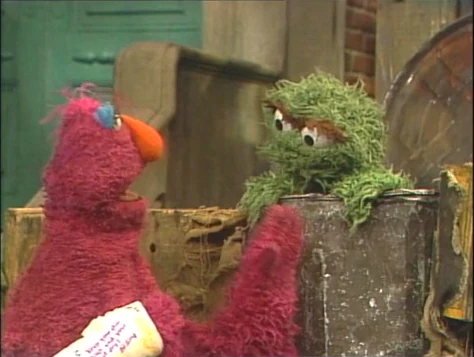 SCENE 3 | Oscar admits that even Grouches can sympathize with someone who has a broken arm, and advises Telly to think of things he can do with only one hand ("That's my good deed for the year," he remarks). Telly realizes he can knock on Oscar's trash can, wave hello to Oscar, and give him a friendly pat. An annoyed Oscar shows him that he can also wave goodbye, and suggests he do so. Telly gives it a try, but upsets Oscar again when he comments that he prefers waving "hello." |