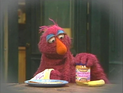 SCENE 1 | Telly Monster welcomes the viewer, noting how his arm is still in a cast. Even though he has a broken arm, he says there are still some things he can do, such as making the peanut butter sandwich he's eating... |