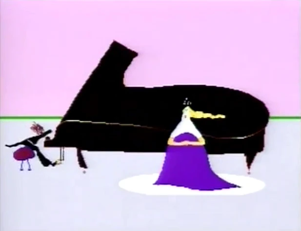 SCENE 2 | Maria now finds Telly listening to classical music on a tape player. He explains how he's been imagining Maria helping him play various musical instruments, as cutaway sequences feature Maria and Telly working together to play the violin, the cymbals, and the triangle. He also imagined himself without an assistant as the conductor of the band, tapping his cast to get their attention. |