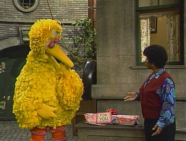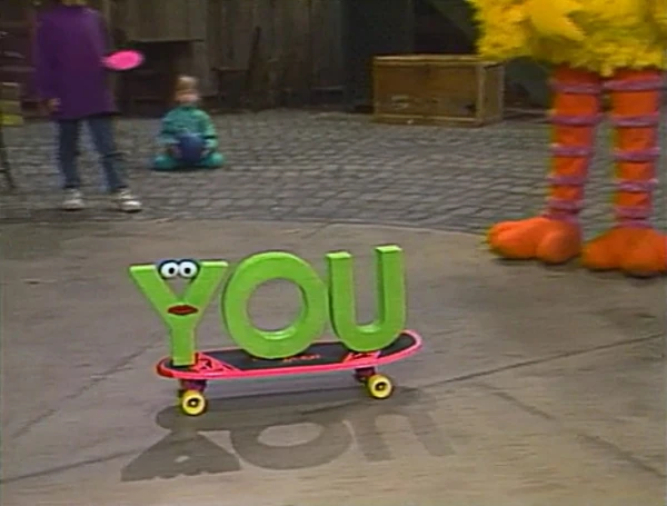 SCENE 2 | Big Bird finishes playing with some kids and finds a present near the steps of 123 Sesame Street. It has a tag on it which says "For You." Big Bird isn't sure who it's for, and Susan notes that the "You" could refer to anyone, even him. The word YOU (David Rudman) pops up as the present is really for him, and asks Susan to open it. It's a skateboard, which the word then uses to roll away. Gina wonders what just rolled past her, and Big Bird has trouble answering her. |