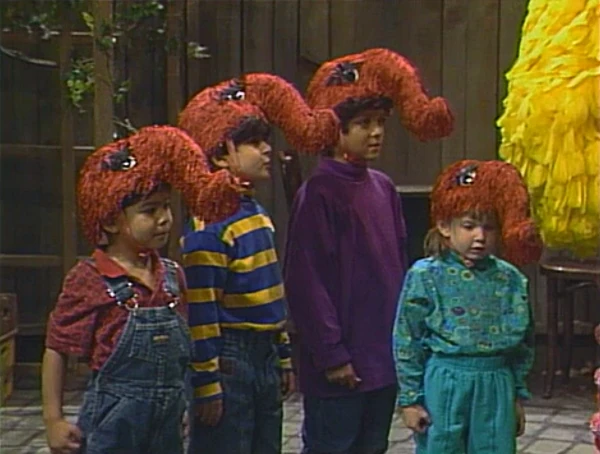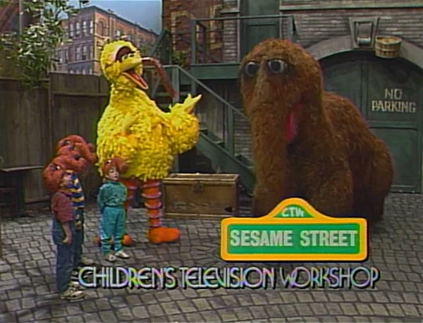 SCENE 6 | Snuffy asks, "How can you tell a Snufketeer?" Big Bird (sporting his own set of homemade lashes and snuffle) and the kids answer, "He's the one who says 'Oh, dear'!" Big Bird says those two words again when he learns that all they're going to do at this meeting is say goodbye to the viewer; Snuffy comments that his Snuffleupagus impression is getting better. He and the kids then announce the sponsors. |