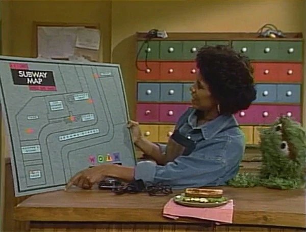 SCENE 5 cont'd | As Slimey and his worm friend get out near Oscar's can, the worm subway announcer (Martin P. Robinson) announces the sponsors. |