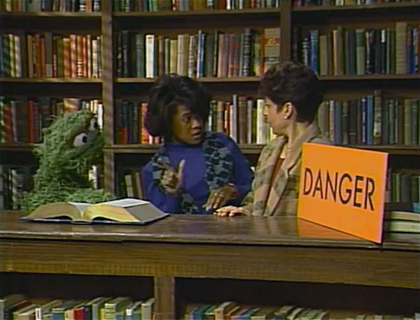 SCENE 4 | Oscar enters the library carrying a DANGER sign, telling Lisa and Linda that the next subway entrance will be built inside. The librarians explain the entrance should be outside by the steps as planned, but Oscar tells them that Slimey made a miscalculation: he labeled the entrance 97 feet from the Fix-It Shop instead of 79. Suddenly, POW! A nearby book in front of them explodes, and two of the worm workers emerge from the hole. |