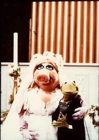 The curtain opens on a church interior. Rowlf plays the organ, and a group of pigs sits on one side, while a group of frogs (and Fozzie) sits on the other. Kermit enters, a bit baffled, but goes to the altar anyway. Marisa and Animal watch from the wings as the (real) wedding ceremony begins. When prompted to say "I do", Kermit instead introduces Lew Zealand, who immediately starts throwing fish around willy-nilly. To Piggy's chagrin, the scene ends in chaos. |