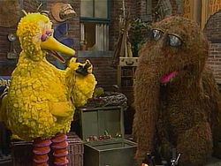 While Oscar and Prunella continue exchanging banter, Big Bird and Snuffy continue their search for a broken toy. |