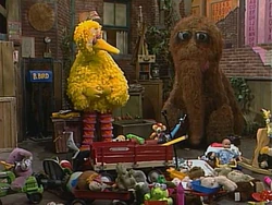 SCENE 2 | Snuffy invites Big Bird to meet Prunella with him, but Big Bird wants to find a broken toy to welcome her with, knowing that Grouches like broken things. |