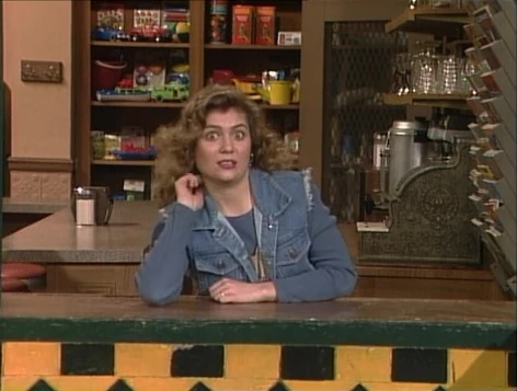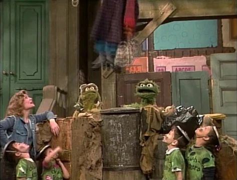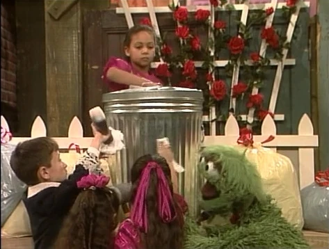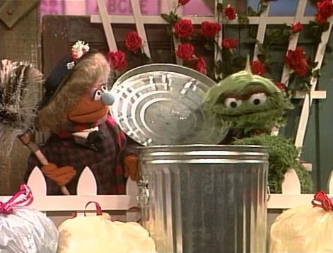 With a wave of the feather duster and the word "Alakazam," Super Nanny instantly transforms the surrounding area. Oscar's trash can is now a shiny new receptacle. The Grouchketeer girls are well-scrubbed in nice Sunday dresses while the boy wears a Fauntleroy-style suit. The unsteady stack of barrels, crates, and rags has become a single wooden box. Garbage bags are brightly colored and neatly tied, while a white picket fence and roses growing on a frame complete the decor. Oscar's hair is neatly scrubbed (save a cowlick sticking up à la Our Gang member Alfalfa) and he's wearing a collar and bowtie, while Irvine sports a brand-new bonnet. Oscar regrets opening his big mouth, but he's even more appalled when he looks closely at his clean trash can: curtains everywhere, no furniture in the swimming pool, a Princess phone, and track lighting. Irvine laughs at her uncle's neat look, while Oscar bemoans the fact that 24 years of work have been destroyed. As the last straw, Fluffy's trunk surfaces from the can, adorned with pink ribbons. |