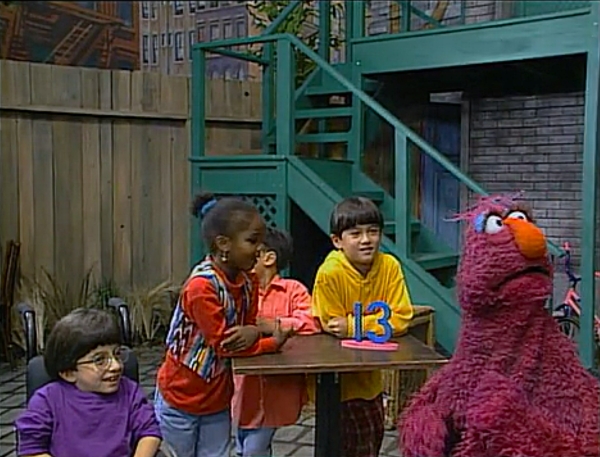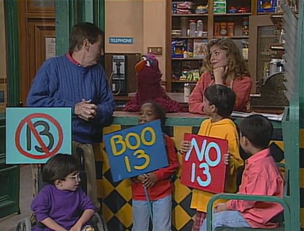 SCENE 4 | Telly and the kids hold protest signs, believing the number 13 should be banished. Bob and Gina explain that it's just a coincidence, as well as what the word means. Telly isn't convinced until it stops raining and Bob and Gina encourage him to try saying the number again. He and the kids say the number, and it doesn't rain! Finally, everyone gets to count to 13 before Telly moves on to talking about the letter of the day, X... and it begins to rain again. |