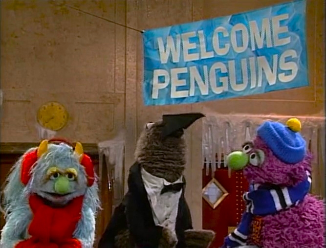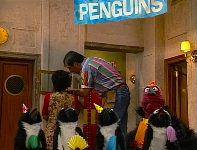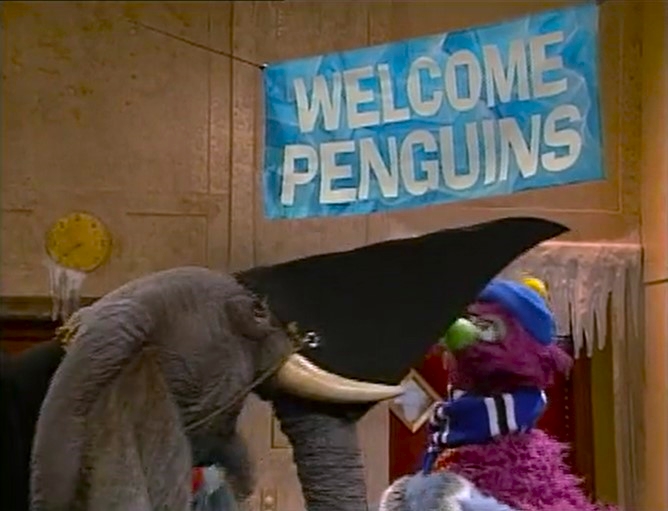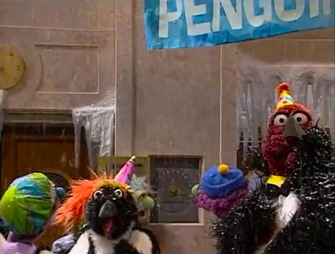 SCENE 1 | Gina welcomes the viewer, noting that it's very hot on Sesame Street today. Telly enters dressed as a penguin, on his way to a penguin party (aka the "Snow Ball") being held at the Furry Arms Hotel. He has been invited to sing, dance, slide on ice, and eat fish with the other penguins. Wolfgang shows up and goes crazy when he hears there will be fish. Some of the real penguin party-goers pass by and tell the seal to stay away, knowing he'd likely eat up the entire supply. Telly says he'll bring Wolfgang back some fish, and Gina goes inside Hooper's Store to turn on the air conditioner. A few more party penguins pass by and Wolfgang follows them. |