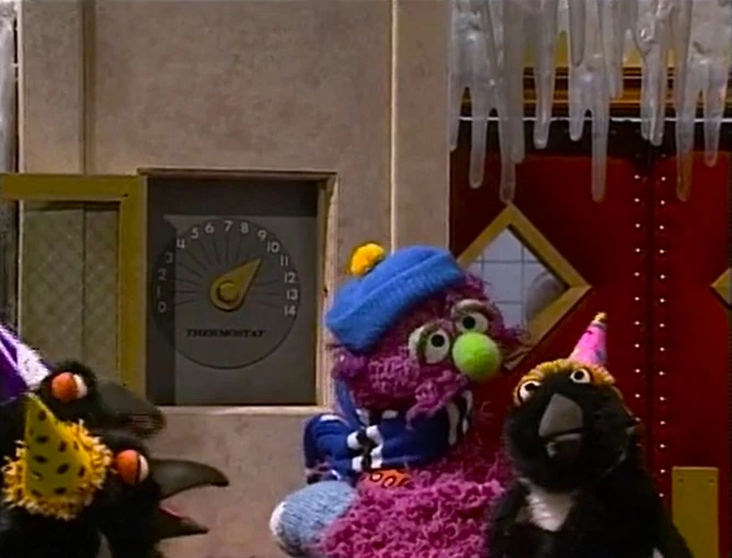 SCENE 5 | Telly and the penguins lament about the hot weather and the broken air conditioner, trying to cool themselves off with paper fans. While Maria and Luis try to fix it, the penguins attempt to solve their problem in different ways like imagining they're cold, shivering, and doing a "cold cheer," none of which help them. Maria and Luis inform them to keep it down and that Hooper's has a working AC, so the penguins hightail it over there. Telly tries to follow them, but gets caught in the revolving door. |