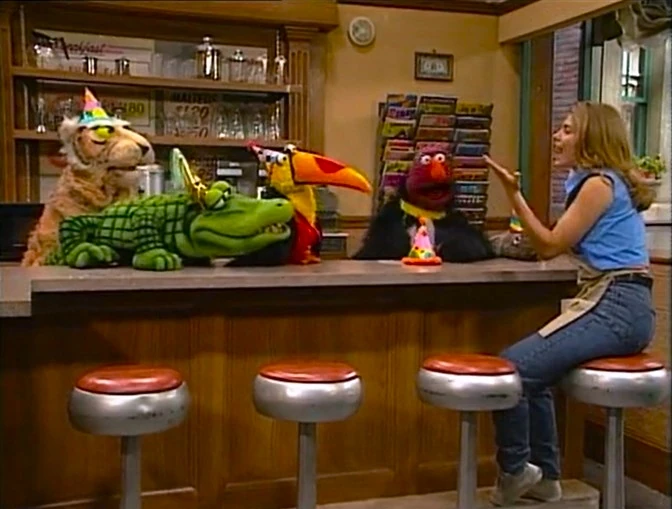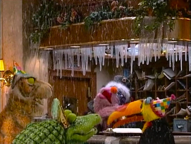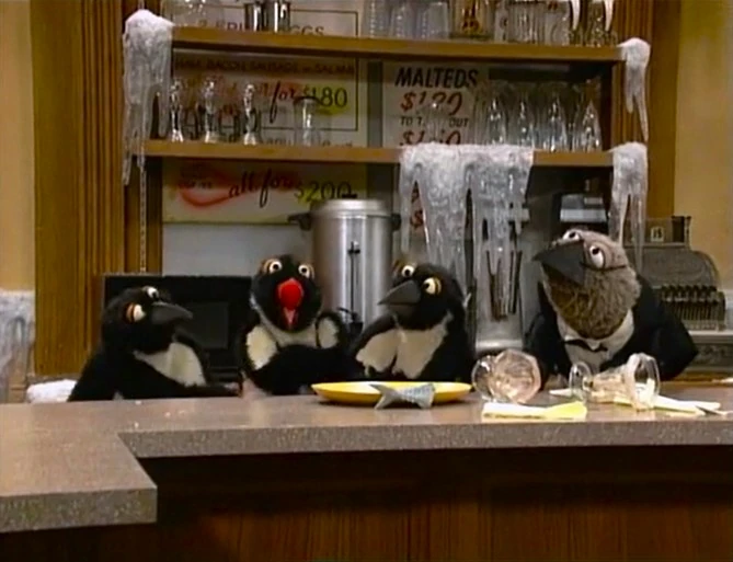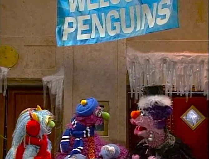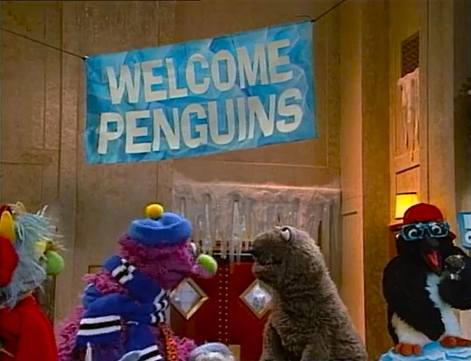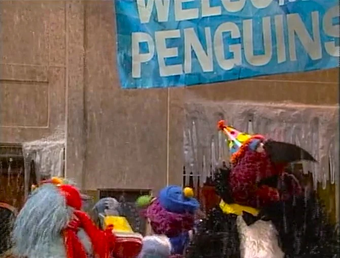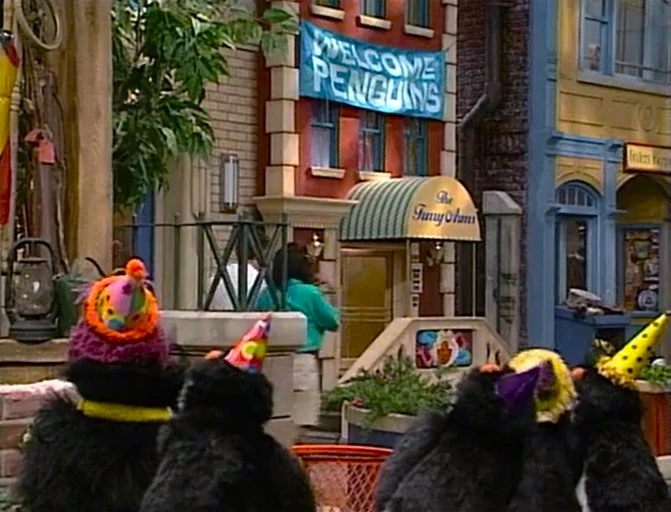 Gina announces the sponsors as the penguins walk by Hooper's Store, wondering who ate all the fish. When they leave, a stuffed, weary Wolfgang rests on the counter with a fish tail dangling from his mouth, and Telly arrives and asks Gina if she can accommodate the jungle animals until the Furry Arms warms up. Gina remarks, "Just a normal day on Sesame Street..." as the animals begin to party. The credits follow. |