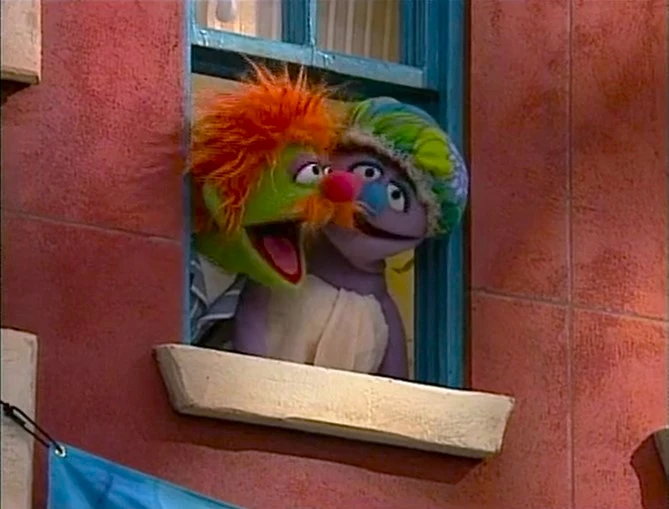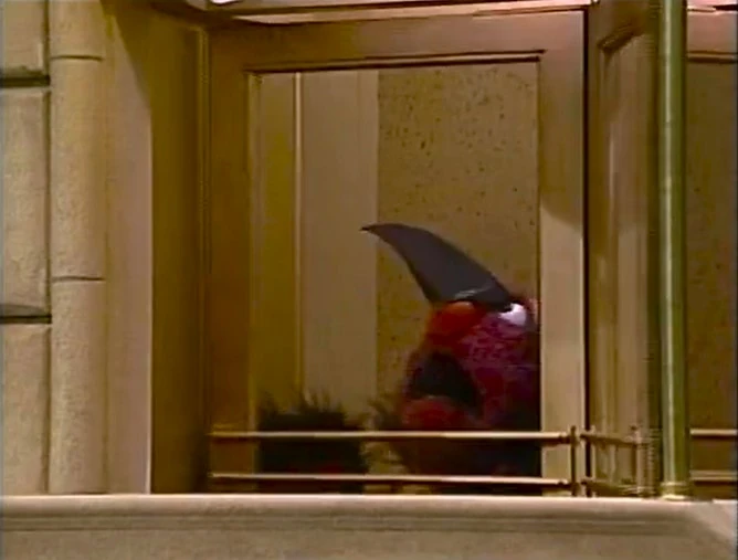 SCENE 4 | A sweaty Big Bird walks by the Furry Arms, and asks two shivering tenants on the third floor why they have their windows open on a hot day like today. They explain that the whole building has been frozen up to prepare for the penguins' stay, and Big Bird thinks they should stand up to the management and tell them to warm the building up again. |