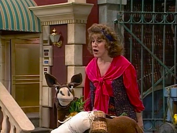 SCENE 4 | Oscar lets Ruthie use his pet mule Iago (David Rudman) to help carry her items while her motorcycle is in the shop. Ruthie finds Oscar's goodwill very out of character until she learns that stubborn Iago won't go the same way she pulls. Ruthie remembers a trick she learned when dealing with another mule - if she pulls the opposite way, Iago will instead go the way she wants. This method works and she leads him to around the corner. |
