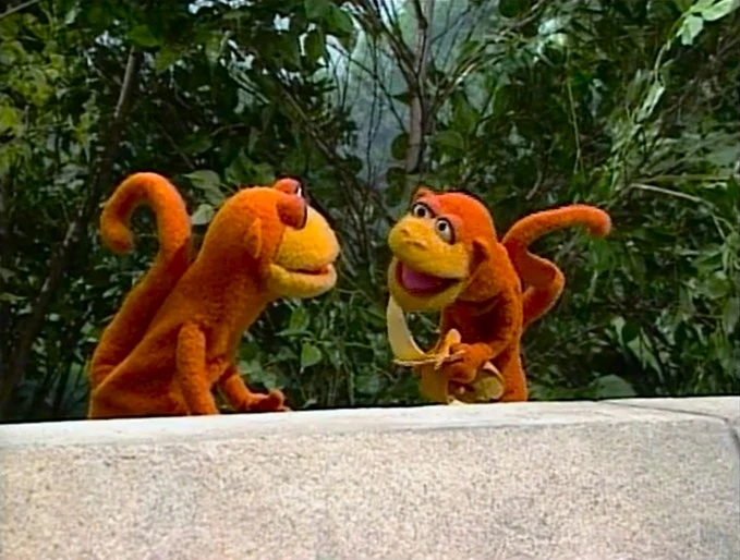 COLD OPEN | Swinging from their tails on the swing set bar in the park, Joey and Davey Monkey introduce today's sponsors, as well as their favorite word: BANANA. They have a banana for their lunch, but Davey isn't sure if it's really a banana. It may look like one and smells like one, but Davey confirms it by eating the whole thing, infuriating his brother. |