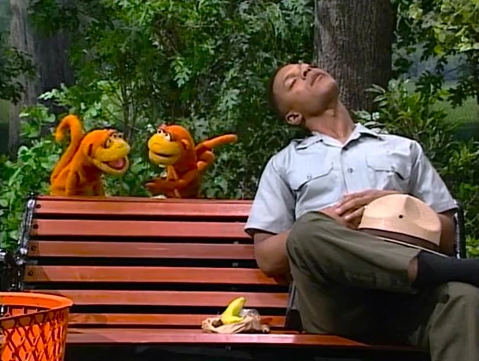 SCENE 1 | Davey and Joey find Jamal on his break, asleep on a park bench with a banana next to him. Since Davey ate the last banana, he gives Joey ideas on the best way to get it, settling on just asking for it. As the two argue over whether he should do it softly or loudly, Jamal wakes up and eats the entire banana. |