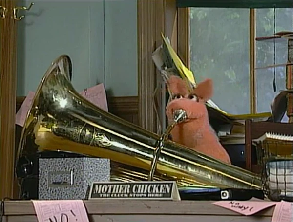 SCENE 2 | Ruthie continues polishing as she resumes the story, where Mother Chicken decides to write a rhyme similar to "Hey Diddle Diddle." First up is the pig, who can't play any of the suggested instruments Ruthie happens to have. He can play the tuba and blasts Ruthie through the wall with one note. Mother Chicken has her first line: "Say dooba dooba, the pig played the tuba." |