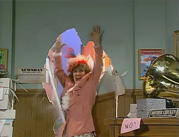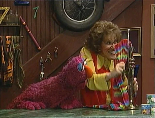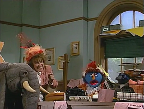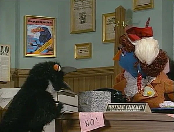 SCENE 5 cont'd | Back in the present, Telly loves the nursery rhyme and makes up one of his own about the sponsors. Mother Chicken, in voice-over, also chimes in to mention the Children's Television Workshop. |