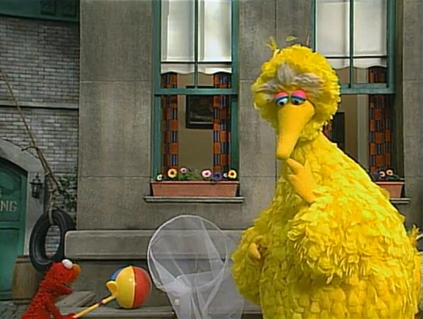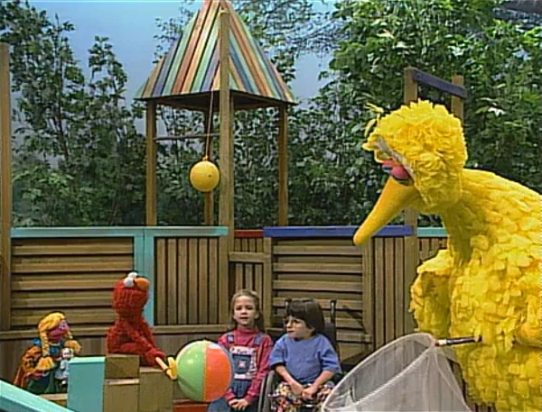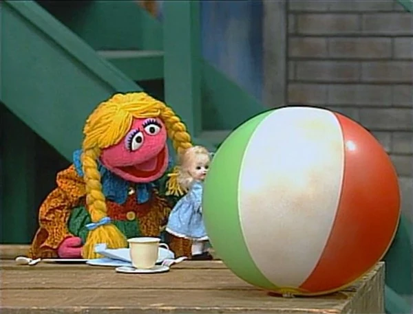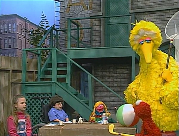 SCENE 1 | Elmo's beach ball lands on the crate where Betty Lou, Tarah, and Eva are making up a story about a princess' tea party. Elmo declares it a successful "tea-off" and prepares to hit the ball towards Luis in front of the Fix-It Shop, who will throw it into the butterfly net Big Bird is holding. However, Betty Lou insists on pretending that the ball is "Prince Ted," who, in their story, had a spell cast on him by a wicked witch to prevent him from marrying the princess (her dolly), and thus proposes that Elmo can break the spell by hitting the ball through the net. Elmo likes the idea and hits the ball, which Luis proceeds to pitch into Big Bird's net. Everyone cheers - except for Betty Lou, who says that Prince Ted is still a ball. They decide that the "spell" will be broken by the time the last hole is played, and so they go on with the game. Big Bird explains all this to a confused Luis. |
