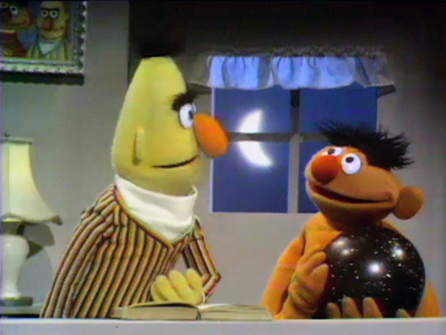 | Muppets | Ernie and Bert: Ernie Prepares for His Bath — Bert scoffs at Ernie bringing an umbrella, a flashlight, and a bowling ball to the bathtub. (First: Episode 0269) | |