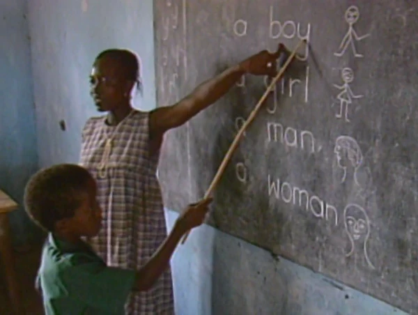 Film | A girl goes to school somewhere in Africa. We see the girl getting ready to go to school, as she washes herself and brushes her teeth, puts on her clothes, brushes her hair, and takes her lunch, all with some help from her mother. We see her walking past her neighbors and watching her classmates play outside as she arrives at school. The bell rings, and the girl enters the school, where the teacher is passing out chalk to her students. We see the teacher teaching the students the English words: "a boy," "a girl," "a man," "a woman," which she has written on the board, along with a drawing for each word. The students repeat the words, then write them down on their individual chalkboards as the girl remarks, "We are learning to read and write." The students then jump up and down, as the teacher looks on, smiling. Next, we see the students jumping outside excitedly, now that school has finished. (First: Episode 2658) |