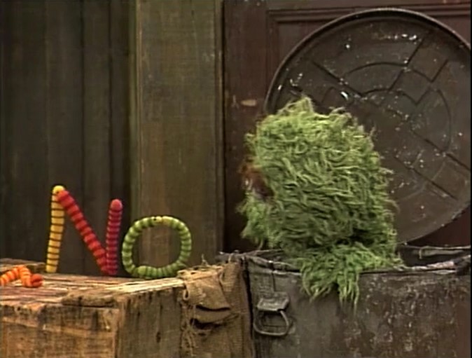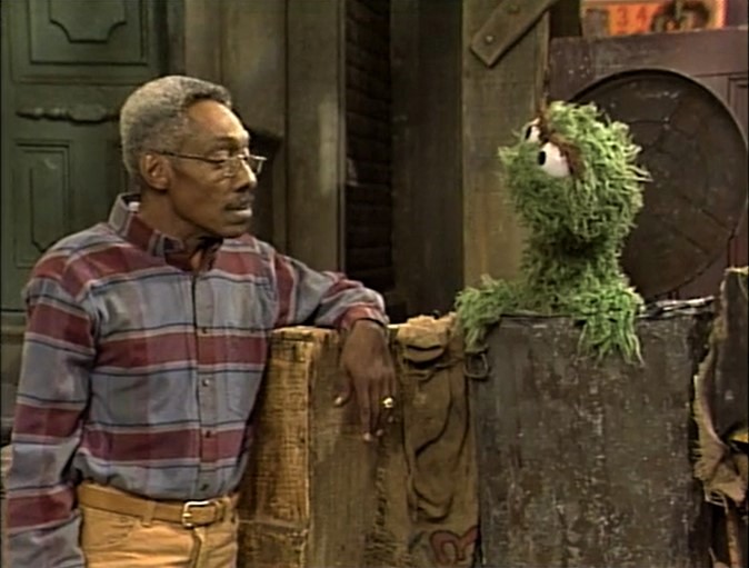 SCENE 3 cont'd | In a flashback, Oscar hangs out in the park on a rainy day. He watches as some worms play in the mud, including a baby worm, who takes notice of Oscar. The worm (Slimey) makes his way to Oscar, crawls up on his shoulder, and falls asleep. Ever since, he's lived with Oscar in his trash can. |