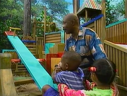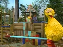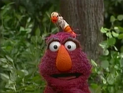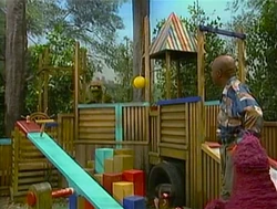SCENE 1 | At the playground, Slimey gets into position as Grundgetta explains how the trick will work: Slimey sits on one end of the see-saw, and when Jenna see-saws down, Slimey will be flung in the air toward the trash can. After the countdown, Gordon helps push Jenna down on the see-saw and Slimey goes flying... right onto Telly's head. Grundgetta blames him for Slimey's failure while Telly points out he wouldn't have gone far anyway, but he's still proud of Slimey for his first try. |