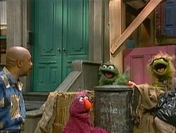 SCENE 2 | Gordon places Lonnell on Jenna's side of the see-saw, believing the more weight they have the farther Slimey will fly. As the countdown begins, Telly can't decide on whether to stay at the playground or Oscar's can to witness the next attempt, eventually deciding to rush to the trash can to see the splashdown. Slimey is rocketed toward the sky and almost reaches the trash can, but misses and lands on Telly's head again. Grundgetta accuses Telly of ruining Slimey's stunt once more. |