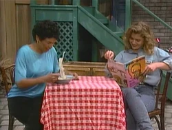SCENE 4 | Big Bird is ready on his end of the see-saw and after the countdown, he sends Slimey flying much higher than before. He lands right in the trash can, but misses the pool and instead lands on the trampoline. He's sent flying away again, landing right into Maria's lunch. "What's this worm doing in my soup?" Maria asks Gina. |