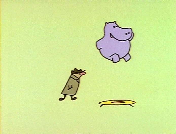 Cartoon | The detective sees a hippo bouncing on a trampoline, and wonders how the hippo can bounce, since hippos are heavy, but the hippo thinks that he is light. (First: Episode 2537) cut from the Noggin version |