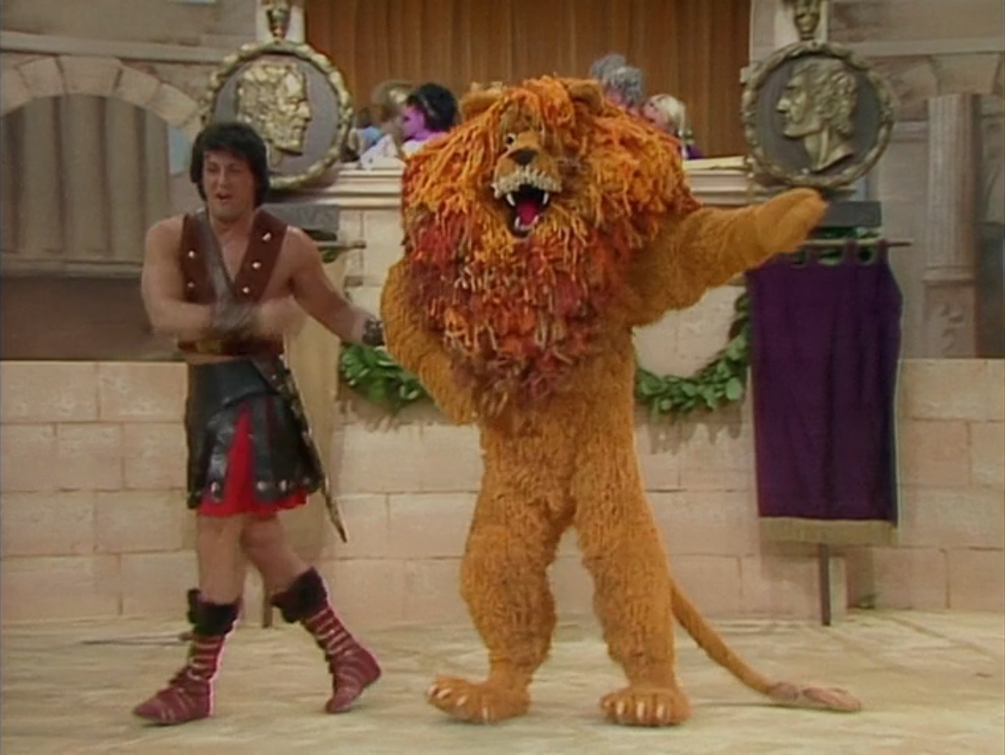 The curtain opens on a Roman coliseum setting. A lion growls in a cage. Rowlf and Zelda Rose assume the roles of Caesar and Calpurnia. Sylvester the gladiator emerges, and the groupies go nuts from the wings. He tosses his helmet to a pig in the audience.
