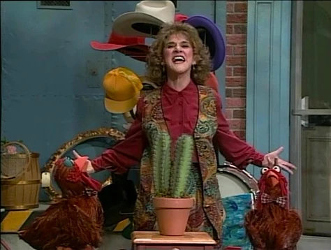SCENE 4 | Ruthie will now perform the most amazing and complicated act today - standing in front of a hatrack, in back of a cactus, between two bow tie-wearing chickens, with one foot up on a box and the other down on the ground (all while singing about it). |