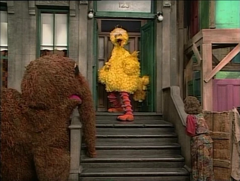 SCENE 1 | Snuffy and Ruthie come across Big Bird, who wants to show them "the most amazing thing in the world." He demonstrates using the front door of 123 Sesame Street (and through song) how he can be outside and inside at the same time. |