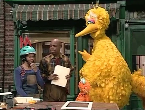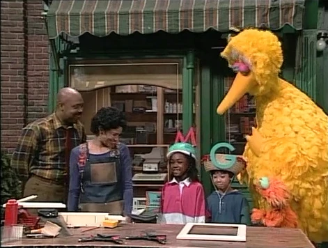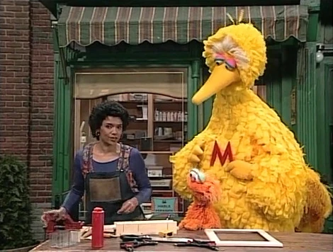 SCENE 2 | They catch up with Maria at the Fix-It Shop and try to get her to hold the M, so they can say, "M... Maria!" However, Maria demonstrates that she needs both hands to work with. Big Bird goes to find a solution, while Zoe reassures her he'll think of something. (Maria: "That's what I'm afraid of.") |