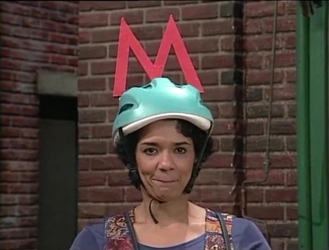SCENE 3 | Big Bird returns with a helmet with the M attached. Maria puts it on and the two repeat "M... Maria!" as they go in and out of frame. |