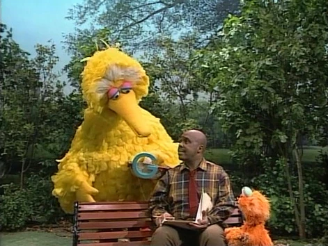 SCENE 4 | Big Bird and Zoe explain the premise of their game to Gordon, clarifying why Maria has an M on her head. The two decide to shift to their G game, where they must find something that starts with G. They realize that Gordon's name starts with G and run after him. |