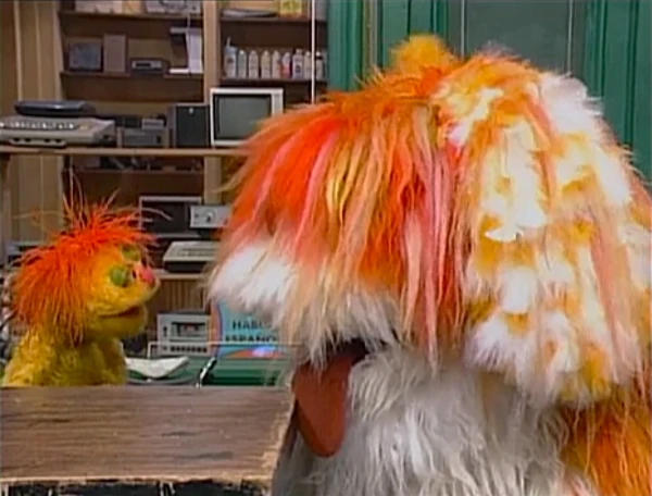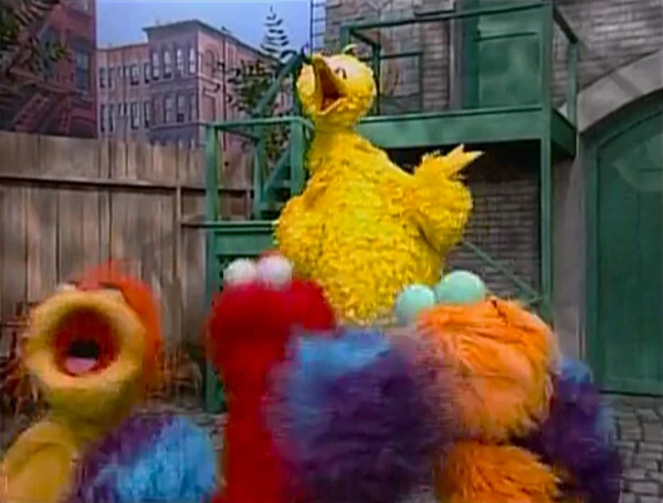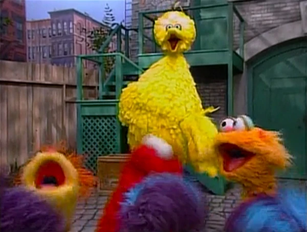 SCENE 2 | The monsters cheer: "Yakkity yak, front/back. Yakkity yak, Big Bird's back!" Big Bird returns, showing off his back as they celebrate. |