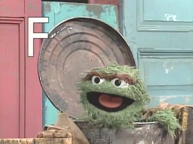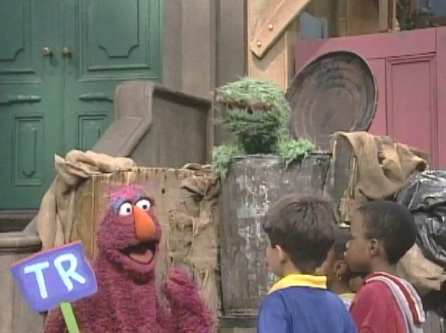 SCENE 3 | Holding a sign with a "TR" on it, Telly and the kids badger Oscar into coming up with words beginning with "TR." His unintended helpfulness through saying "trash can," "trying," and other words during his complaints earn him some cheers and applause from the group, and Telly wonders if tomorrow he'll help with the "BL" sound, which makes Oscar yell, "BLECCH!" |