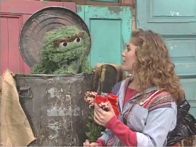 SCENE 6 | Gina finds Oscar practicing being nice and holding a bouquet of flowers, as his mother will be visiting and it'll drive her nuts, thus making her happy. Gina points out it's a nice gesture and infuriates Oscar. He tries to get rid of his nice flowers by giving them to her, but she takes it as another kind gesture and runs off to show everyone. "Some days, being a Grouch is very complicated!" he moans. |