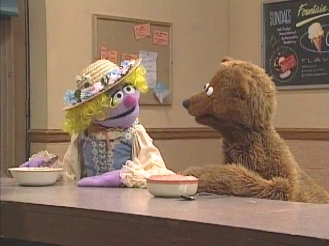 SCENE 4 | Mr. Handford lays out two cream pies on the counter and asks how many there are when added with the two already there. Big Bird, Snuffy, and Alice appear, wearing detective gear and representing the FBA - the Federal Bureau of Addition - to help count the total. They notice that one goes missing, which Alice has eaten. They recommend Mr. Handford call the Federal Bureau of Subtraction to solve this case. |
