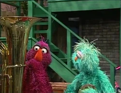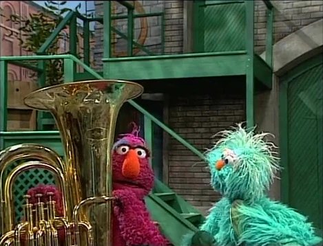 SCENE 2 | Rosita plays the cymbals while Telly plays his favorite instrument, the tuba. They decide to just make up some music, but realize that they disagree about how many notes each one of them will play. They realize this could start an argument (something they both hate) and Savion asks what they'll do about it, so Telly and Rosita decide to run away in fear. |