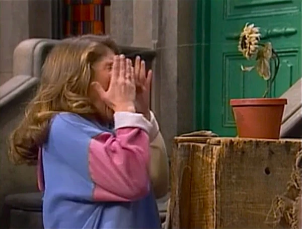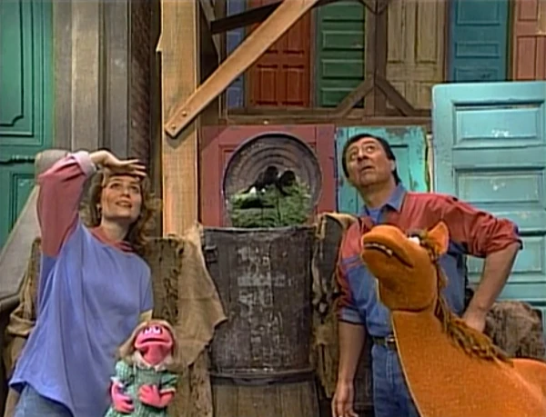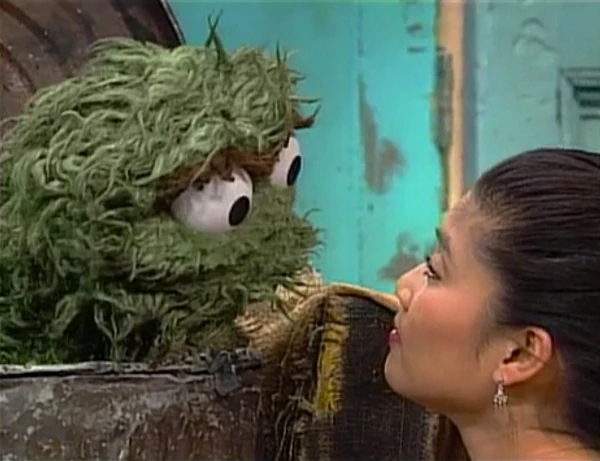 SCENE 3 | Gina passes by Oscar's trash can and sees an "AGUA" sign. She recalls that was part of Telly's list and is sure Oscar will demonstrate it by squirting her with a hose or some other grouchy way. Oscar claims he won't do that; he knew someone would talk about the word for him by putting the sign up and denies using any Grouch method of getting her wet. He does, however, casually take out a bulb from his can and squeezes it, causing the flower next to his can to squirt her instead! |