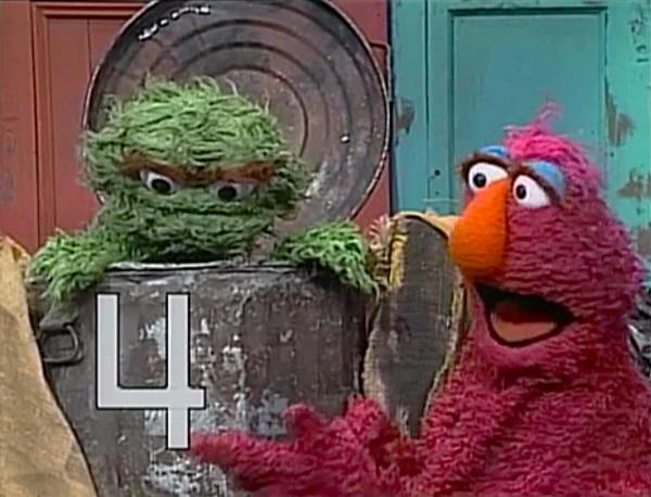 SCENE 1 | First on the list is the number of the day - 4. Oscar stares at the sky using his binoculars, and soon Prairie Dawn, Gina, Luis, and Buster the Horse start looking up too. Oscar then counts the four suckers looking at nothing and becoming annoyed at him. |
