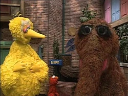 SCENE 2 | In another thrilling episode of the daytime drama As the World Takes Turns, Big Bird wants to come out of Finders Keepers, while Snuffy wants to go in. They both can't fit through the door at the same time, so Ruthie instructs them to... take turns! First, Big Bird steps out of the store, then Snuffy squeezes himself in. Now that Snuffy is inside (and Ruthie is out), there's no one inside to help him. Ruthie attempts to go in, just as Big Bird does the same to retrieve Radar. The three squabble in the doorway as the announcer brings the chapter to a close. |