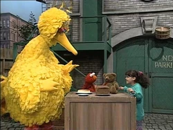 SCENE 4 | In yet another chapter of As the World Takes Turns, Big Bird, Elmo, and Gabi play a game of "Three of These Things" using Radar, a cheesecake, a grape, and a loaf of bread. Elmo and Gabi both have different answers, but are able to relay them by taking turns. However, all three then want to play with Radar in the park... but that's another story. |