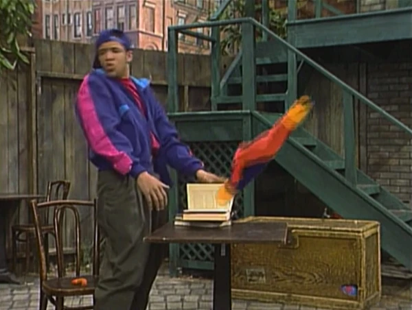 SCENE 3 | Luis looks in amazement as SuperWorm lifts a miniature barbell along the construction wall. Oscar informs Luis that even though SuperWorm is strong enough to lift a Snuffleupagus, he has one weakness: birds. One glimpse or mention of a bird, and he becomes powerless, overcome with fear. Just then, Big Bird comes by and greets SuperWorm. Luis explains why SuperWorm is so scared, and Big Bird tries to explain that he's a very friendly bird. This doesn't seem to help, and Big Bird leaves. |