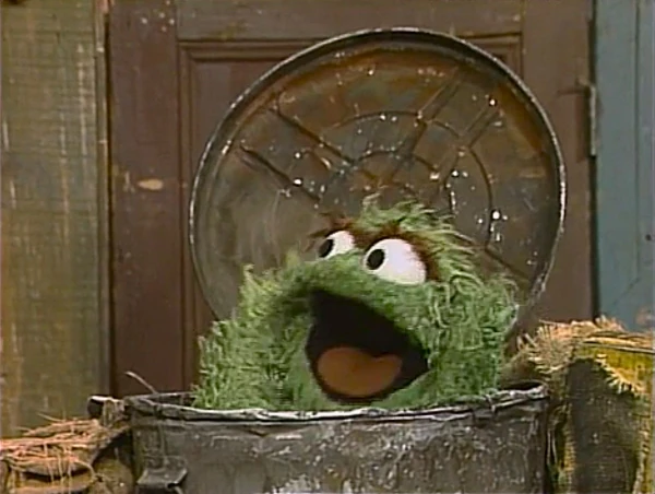 SCENE 4 | Big Bird apologizes to Luis for scaring SuperWorm, and admits that he used to be scared of cats (until he grew over six feet tall). Luis reassures him that SuperWorm isn't scared anymore... but someone else is. He points to the sky, where SuperWorm is carrying Oscar's trash can, with a terrified Oscar inside and Slimey on top! The heroic voiceover announces the sponsors, and Oscar begs SuperWorm to bring him down. |