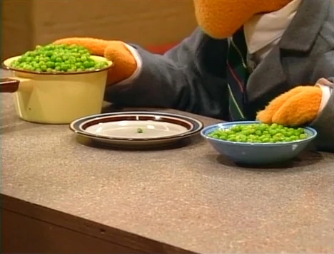 SCENE 5 | Gina and Big Bird read another Calvin & Hobbes comic in the paper when Monty enters Hooper's and orders a pea, though finds it isn't very many. Gina provides him with more (a whole potful), then less peas (in a bowl), which is just enough to his liking. Monty then starts dancing with his bowl of peas rather than eating them. |